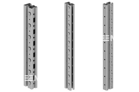 Стойки системы MS8 бывают 2-х типов: открытые и закрытые. Они представляют собой сложнокатанные перфорированные профили с выпрессованным крюком (шаг 50 мм) для облегчения монтажа полок, балок и дополнительных аксессуаров. Изготавливаются из холоднокатаной стали S235.